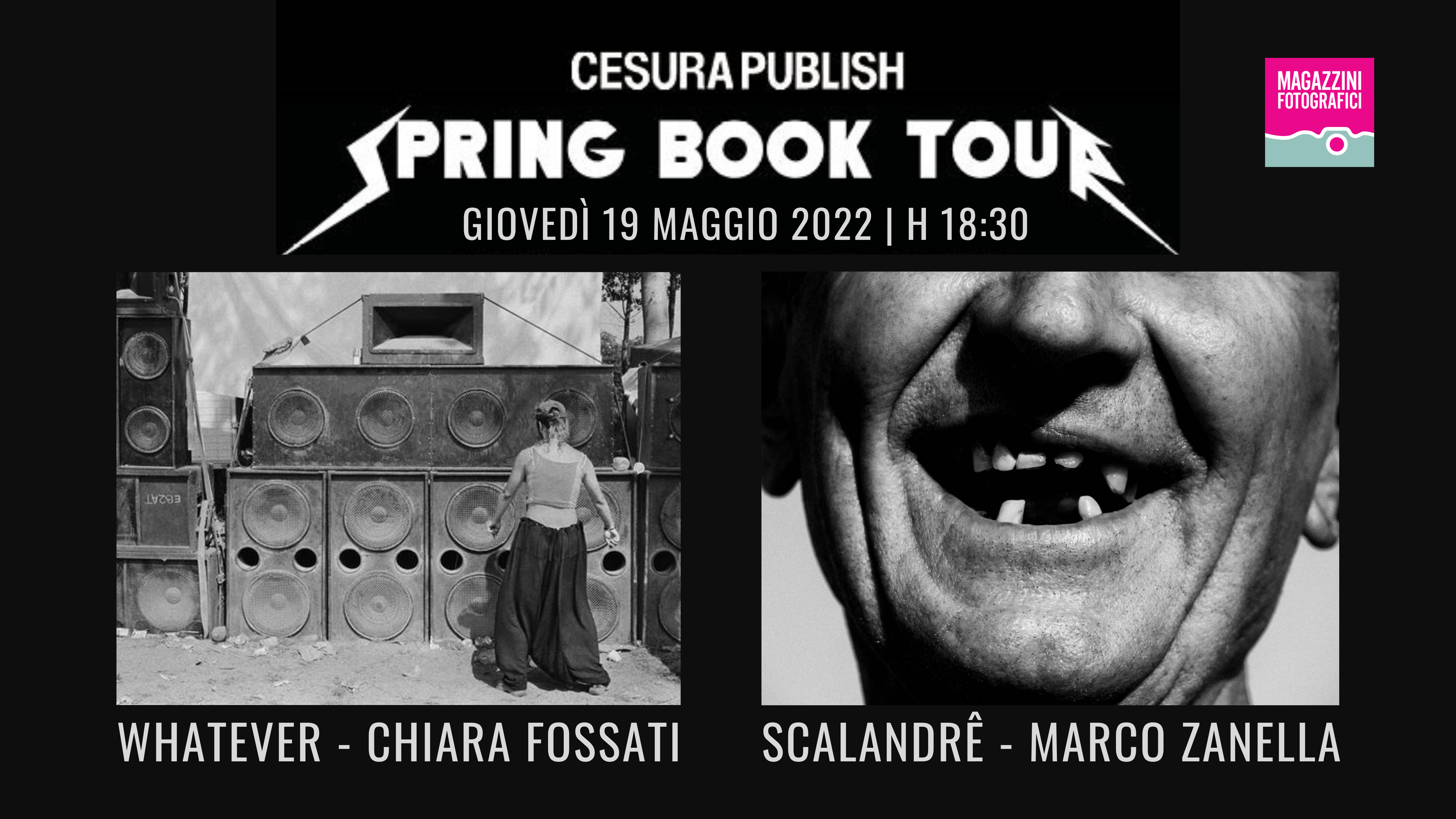 Il 19 maggio alle 18:30 Magazzini Fotografici sarà tappa del book tour organizzato da Cesura Publish, in occasione del lancio dei nuovi libri Scalandrê di Marco Zanella e Whatever di Chiara Fossati.