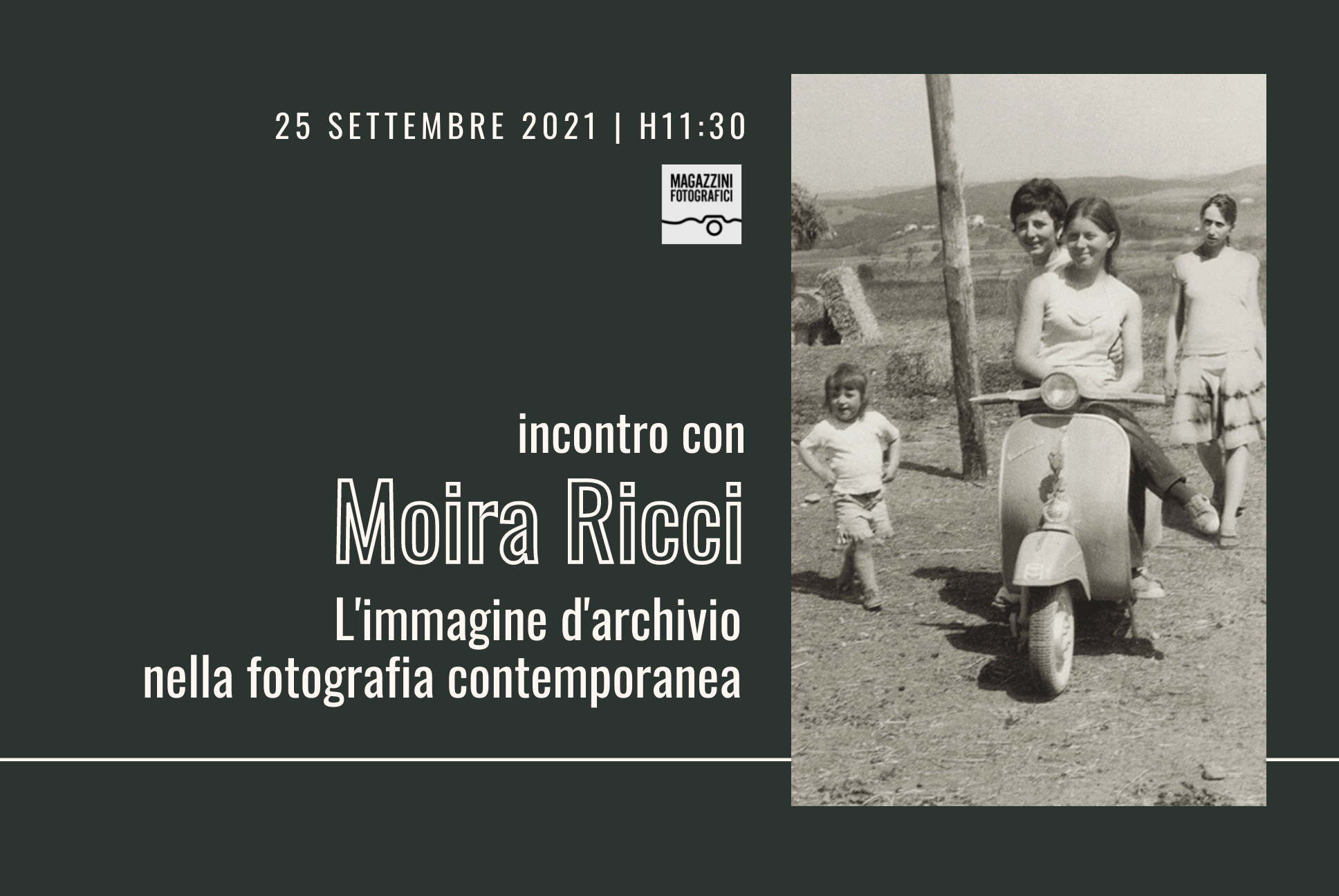 Sabato 25 settembre alle 11:30, ospiteremo un talk presieduto da Moira Ricci, gratuito per i nostri soci, dal titolo “L’immagine d’archivio nella fotografia contemporanea”. Il talk si configura come una occasione di riflessione, ispirazione e accrescimento esperienziale per tutti i partecipanti, un momento di confronto per professionisti e amanti della fotografia.